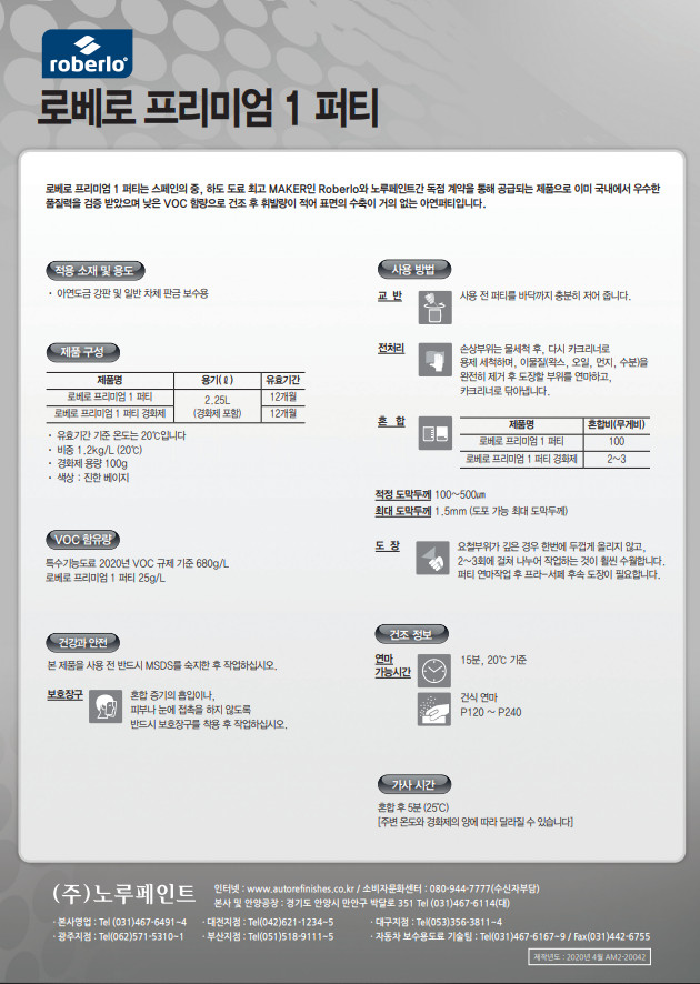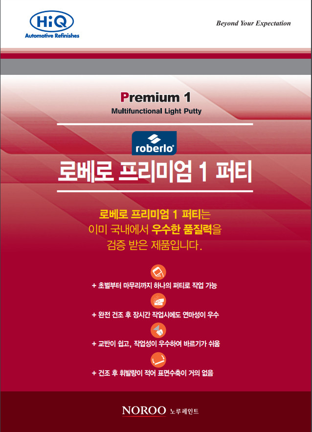 - HOME > 공통도료 > 퍼티 > 노루페인트(NR),로베로 > 로베로 프리미엄1 아연 퍼티 주제+경화제, 2.25L, 1개