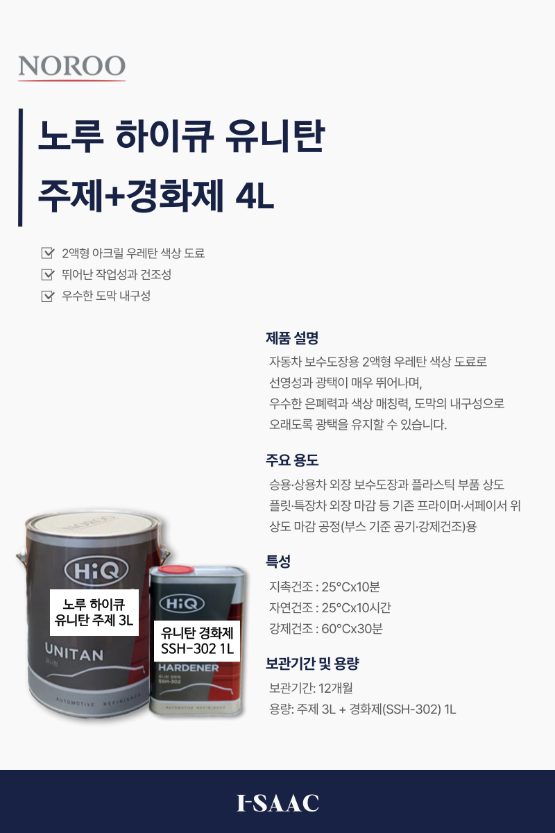 - 아이삭 스토어는 자동차 보수용 페인트 및 부자재 전문 대리점으로, 제품의 성분 및 품질 보증 책임은 제조사에 있습니다. 당사에서 판매하는 제품은 제조사의 규격에 따라 공급되며, 사용자의 부주의 또는 임의 사용으로 발생한 문제에 대해서는 책임을 지지 않습니다.