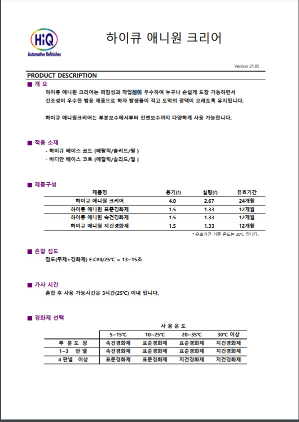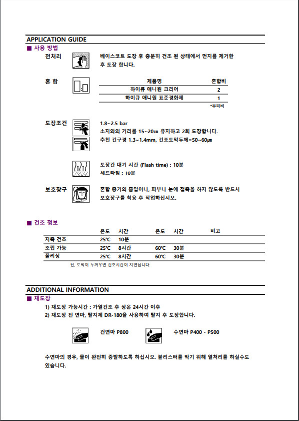 - 혼합 점도: 13~15초 = F.C #4, 25℃